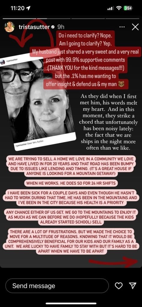 She clarified that his words melted her heart. She also shared that their life isn’t always a highlight reel and Ryan chose to be real with everyone. Trista also said “Life is hard. Marriage is hard.” She noted they are not perfect and their life can get frustrating just like everyone else. Her messages can be seen below.